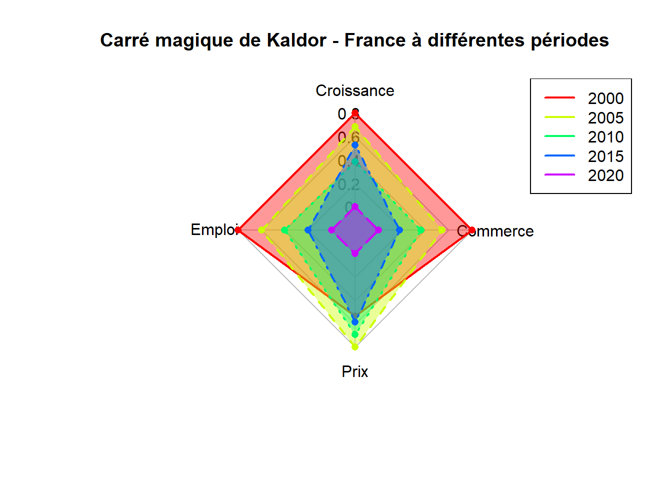 # Étape 1 : Préparer les données data_france <-data.frame( periode =c("2000", "2005", "2010", "2015", "2020"), croissance =c(3.0, 2.5, 1.2, 1.8, -0.5), # Croissance économique (%) emploi =c(93, 91, 89, 87, 85), # Taux d'emploi (%)prix =c(1.5, 2.0, 1.8, 1.6, 0.5), # Inflation (%) commerce =c(0.2, -0.5, -1.0, -1.5, -2.0))# Balance commerciale (% du PIB) ) # Étape 2 : Normaliser les donnéesnormalize <-function(x) { (x -min(x)) / (max(x) -min(x)) } data_normalized <- data_france data_normalized[, -1] <-as.data.frame(lapply(data_france[, -1], normalize)) # Étape 3 : Préparer les données pour le graphique radar # Installer et charger le package fmsb si nécessaire library(fmsb) radar_data <-rbind( rep(1, 4), # Valeurs maximales après normalisation rep(0, 4), # Valeurs minimales après normalisation data_normalized[, -1] ) # Données normalisées ) # Nommer les colonnes pour le graphique radar colnames(radar_data) <-c("Croissance", "Emploi", "Prix", "Commerce")rownames(radar_data) <-c("Max", "Min", data_france$periode) # Étape 4 : Tracer le carré magique radarchart( radar_data, axistype =1, pcol =rainbow(nrow(data_france)), # Couleurs pour chaque période pfcol =rainbow(nrow(data_france), alpha =0.4), # Couleurs remplies plwd =2, # Épaisseur des lignes cglcol ="grey", cglty =1, axislabcol ="black", caxislabels =seq(0, 1, 0.2), title ="Carré magique de Kaldor - France à différentes périodes" ) # Ajouter une légende legend("topright", legend = data_france$periode, col =rainbow(nrow(data_france)), lty =1, lwd =2 )
