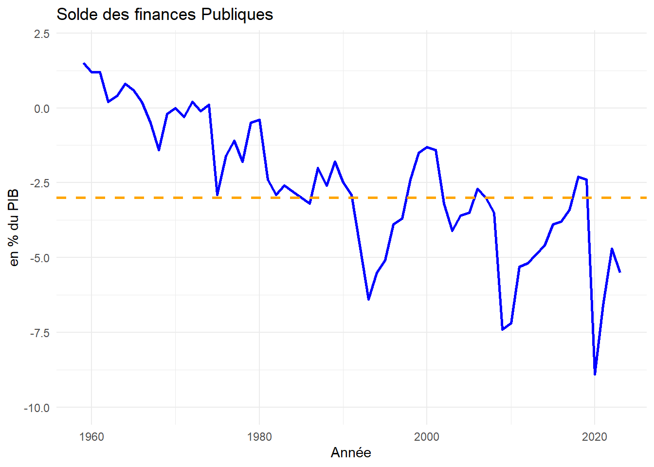 dette <-read_excel("dette.xls") dette$year<-dette$Année dette$deficit<-dette$`Déficit public notifié`ggplot(dette, aes(x =year, y = deficit)) +geom_line(color ="blue", size =1) +geom_hline(yintercept =-3, linetype ="dashed", color ="orange", size =1) +scale_y_continuous(limits =c(-10, 2), name ="en % du PIB") +labs(title ="Solde des finances Publiques", x ="Année") +theme_minimal()