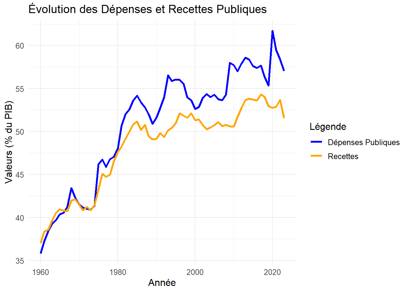 recettes <-read_excel("recettes.xls") # Création du graphique avec ggplot2 ggplot(recettes, aes(x = year)) +geom_line(aes(y = Depenses, color ="Dépenses Publiques"), size =1.2) +geom_line(aes(y = Recettes, color ="Recettes"), size =1.2) +scale_color_manual(values =c("Dépenses Publiques"="blue", "Recettes"="orange")) +labs(title ="Évolution des Dépenses et Recettes Publiques", x ="Année", y ="Valeurs (% du PIB)", color ="Légende") +theme_minimal() +theme(text =element_text(size =12))