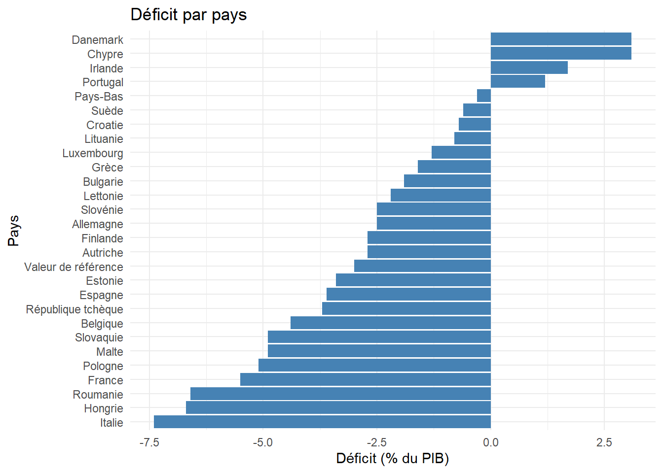 library(readxl)deficit_europe <-read_excel("deficit_europe.xls") deficit_europe$deficit <- deficit_europe$`Solde des finances publiques(en % du PIB)`library(ggplot2)ggplot(deficit_europe, aes(x =reorder(Pays, deficit), y = deficit)) +geom_bar(stat ="identity", fill ="steelblue") +coord_flip() +labs(title ="Déficit par pays", x ="Pays", y ="Déficit (% du PIB)") +theme_minimal()